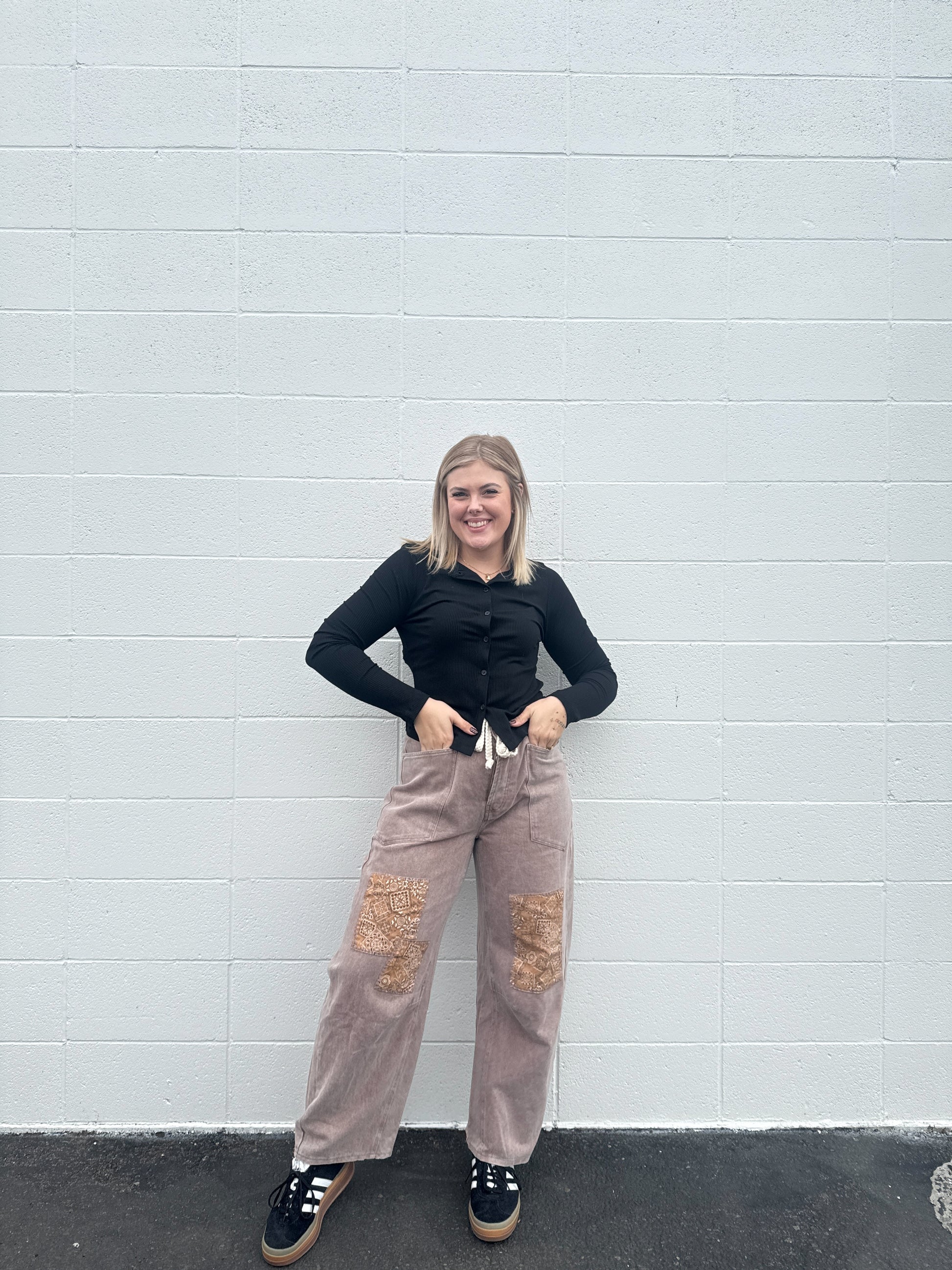 Light rust brown high waisted barrel style denim with matching tones of bandanna patch pockets. Thick braided tie waist plus a button fly, runs slightly baggy. Model is wearing a M here, is 5’6” and it hits her bottom of the ankle making these tall girl friendly!