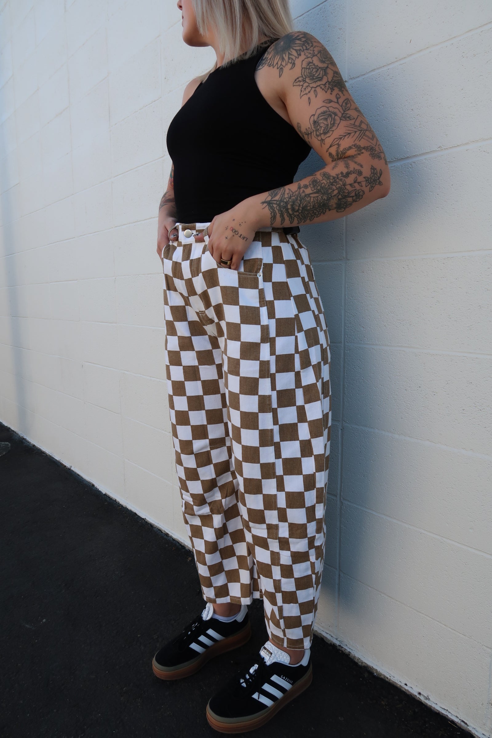 Taupe and white checkered barrel pants. High waisted, stretchy elastic back band. Model is 5’6” and wearing a M here for a perfect baggy barrel fit that hits her at the ankle.