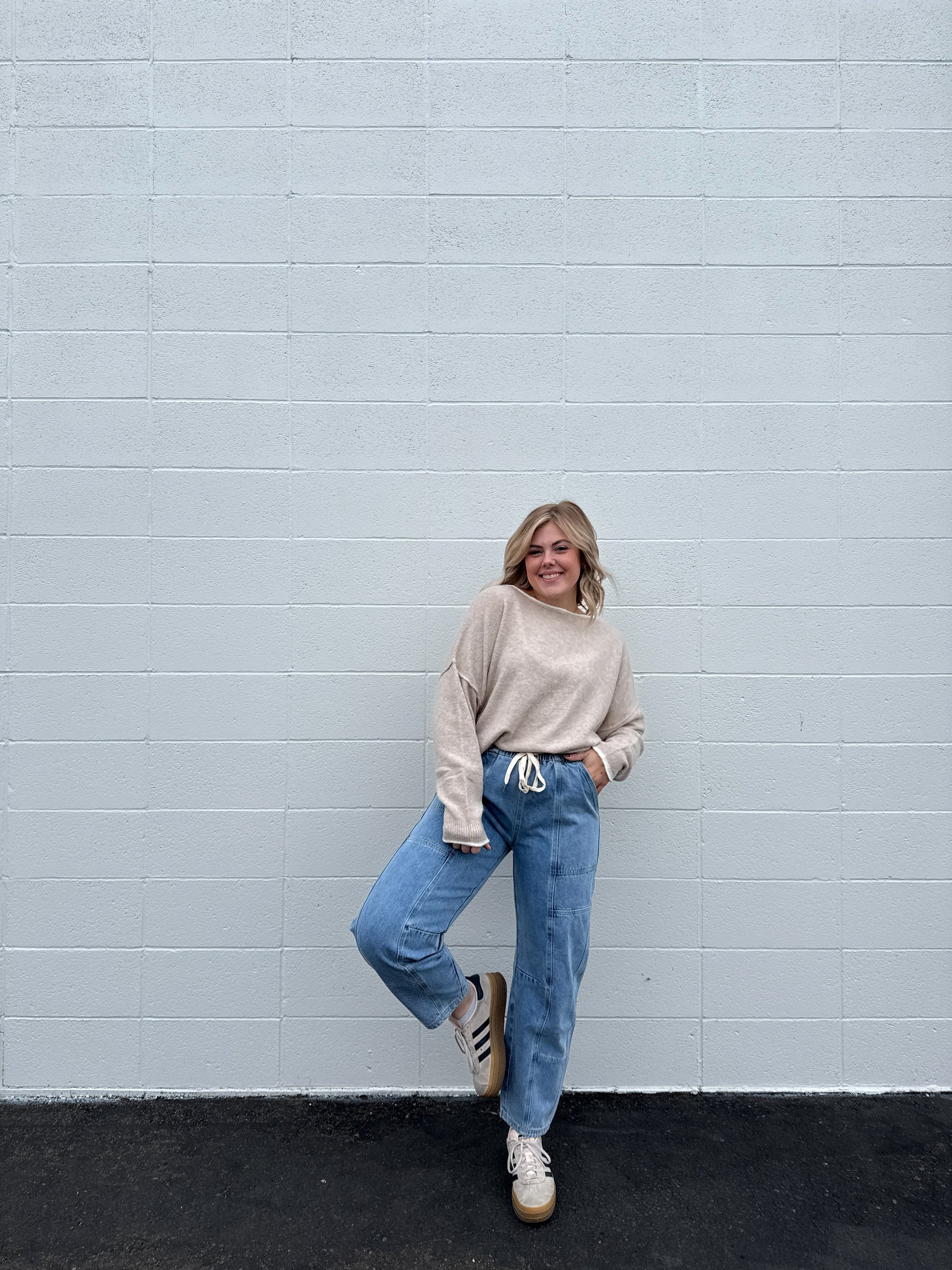 One of our bestselling sweaters is back in 2 new color tones. Plush + soft, this off shoulder sweater sits waist length with a contrasted edging and can be dressed up or down. Model is wearing a M for a perfect fit.