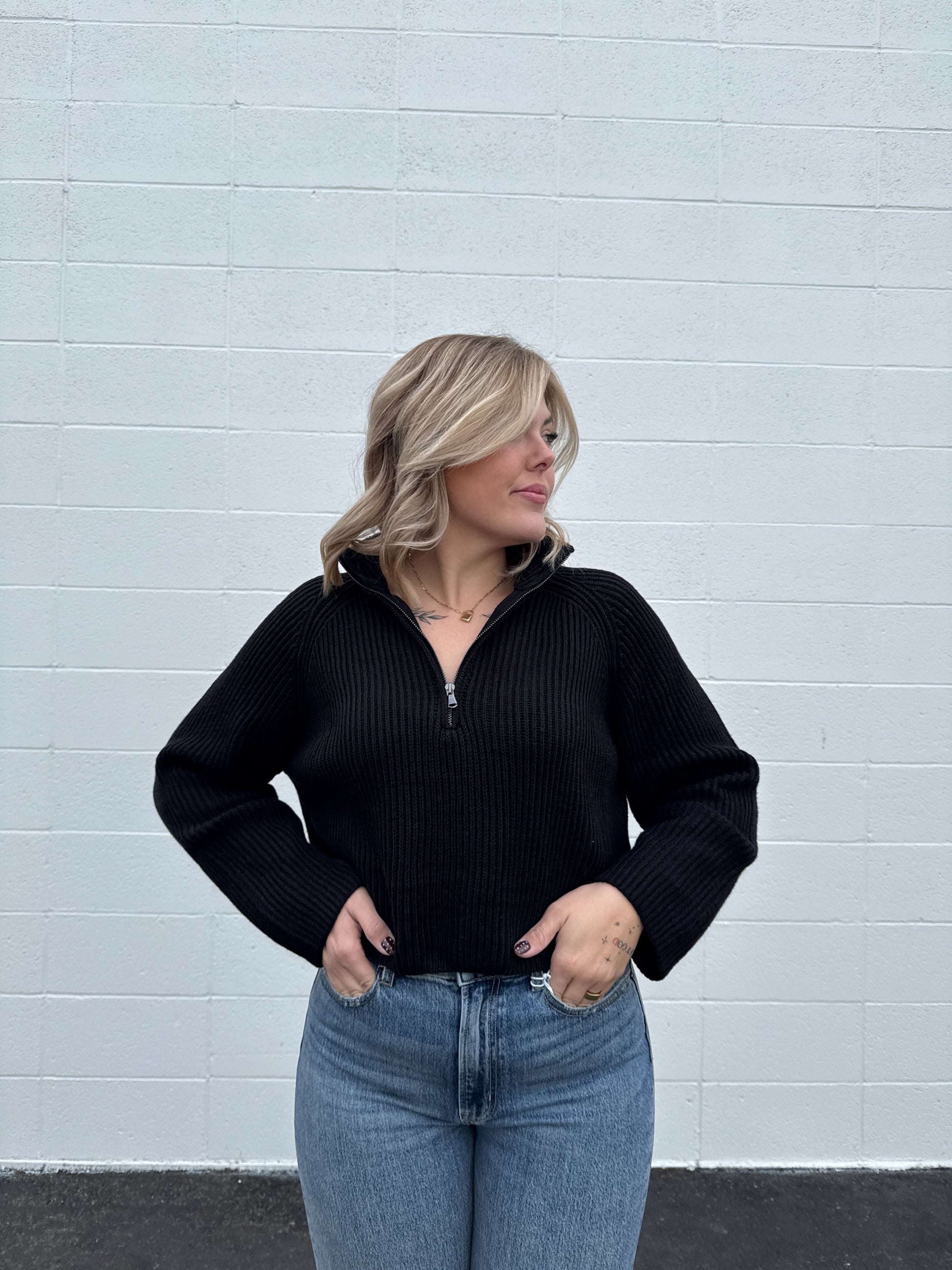 Black ribbed 1/4 zip long sleeve waist length sweater. Plush and cozy, wear with leggings and sneakers or your favorite pair of trousers for work. The possibilities are endless.