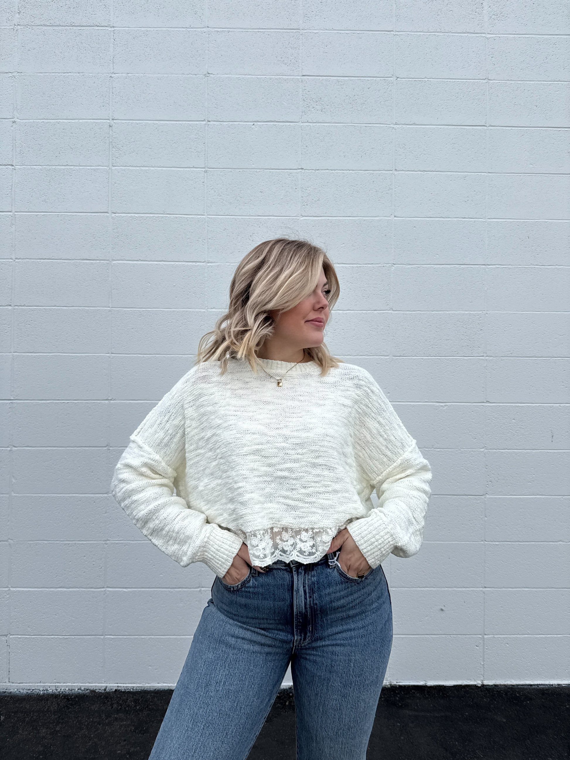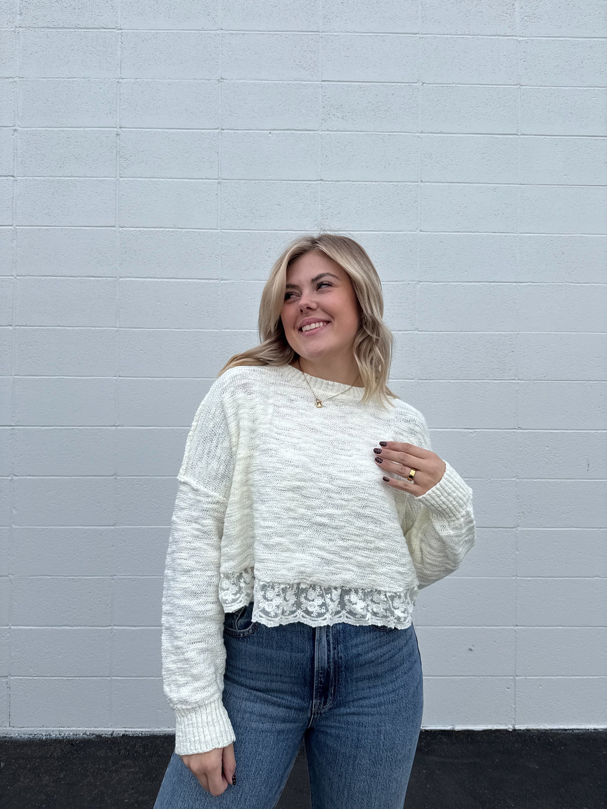 Cozy ivory colored waist length sweater with a matching lace edging. Runs true to size, model wearing a M here. Very universal to dress up or down!