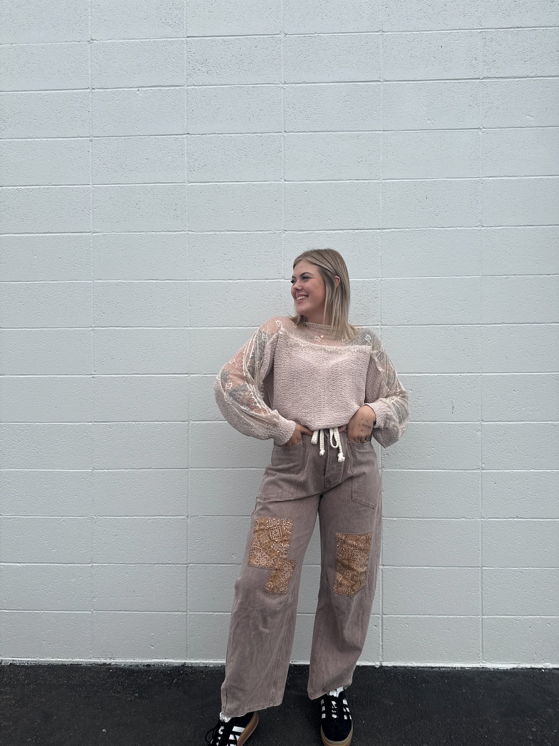 Lace edged sweater with a mushrook toned taupe color. The softest sweater makes up this top and the lace edging elevates the top to dress up or down.